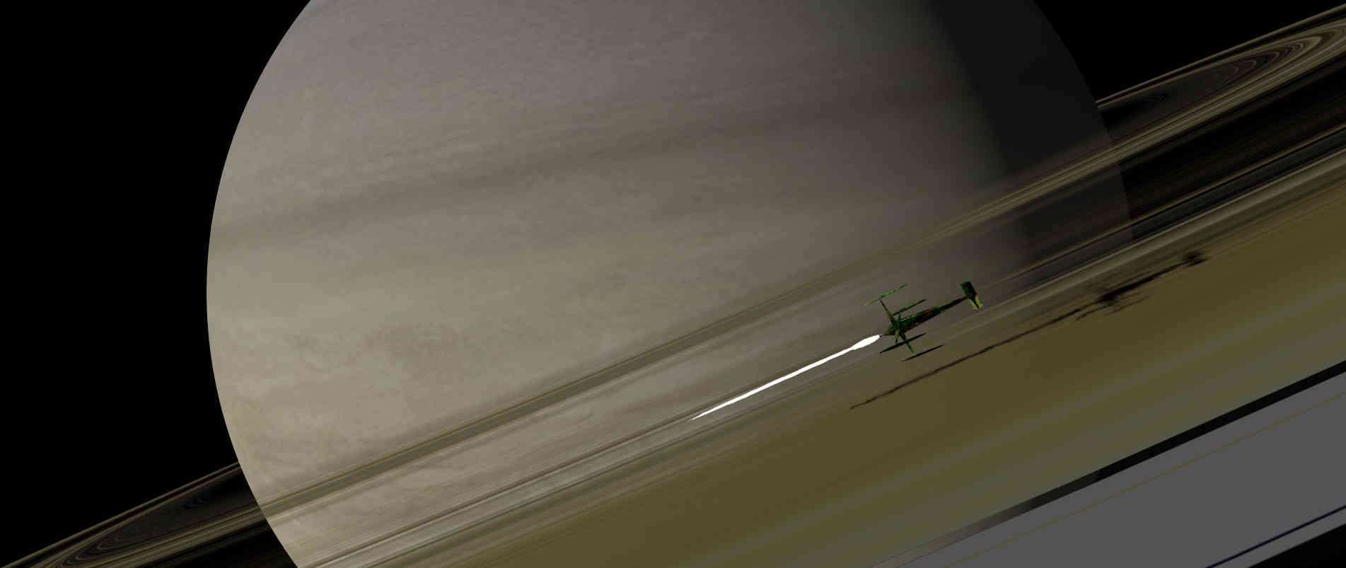survolant les anneaux d'une géante de glace à la pleine puissance de ses moteurs.